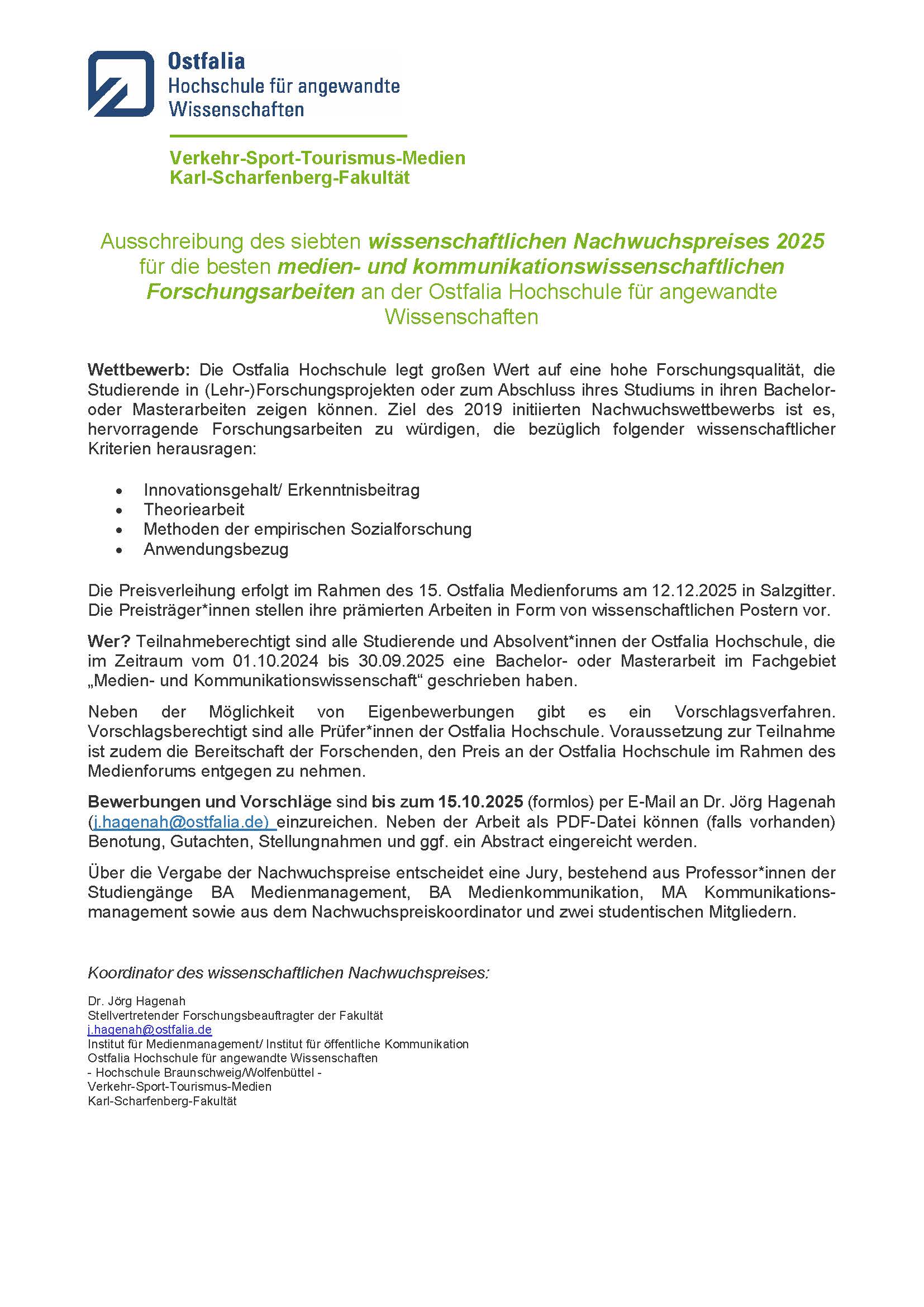 Das Ostfalia Medienforum 2025 nähert sich und mit ihm eine besondere Gelegenheit für engagierte Studierende und Absolvent*innen: Zum siebten Mal wird der wissenschaftliche Nachwuchspreis für herausragende medien- und kommunikationswissenschaftliche Forschungsarbeiten vergeben.