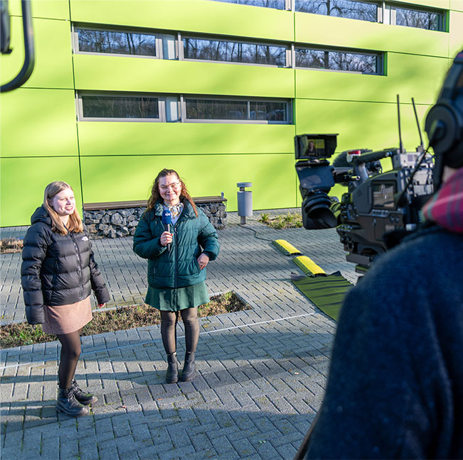 Jula Bruns: Ja, also besonders war die Arbeit draußen, dass wir einmal so eine Live-Schaltung wirklich üben konnten, wie es sie auch wirklich beim NDR stattfinden würde. Das fand ich echt ganz schön. Wir hatten dann auch so einen Knopf im Ohr, dass wir die Regie hören konnten. Wir konnten dabei verschiedene Positionen einnehmen. Einmal die Kamera-Durchführung, dann wie es ist als Reporterin vor der Kamera zu stehen, aber halt auch dann die Regieposition einnehmen.
