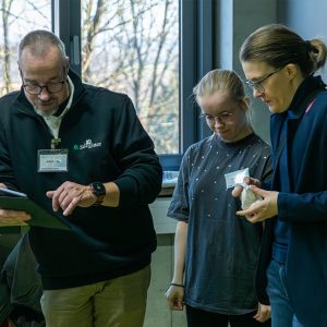 Sascha Reymann (ganz links) steuert einen Sphero Bolt Roboter mithilfe eines Tablets. © Ostfalia | Vakalopoulos